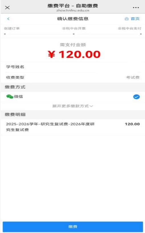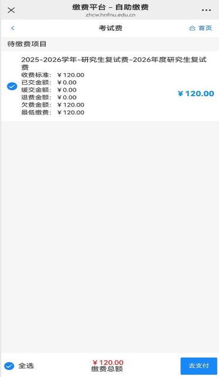 5.选择“考试费 ”缴纳“研究生复试费 ”项目(请务必仔细核对基本信息及缴费金额)确认缴费金额无误后点击“去支付 ”。