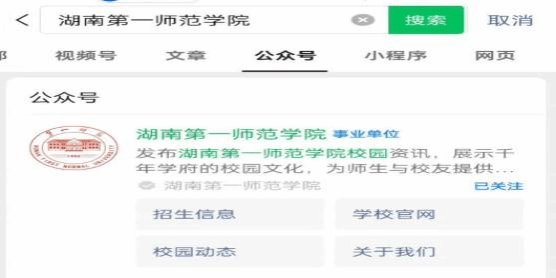 1.微信搜索并关注“湖南第一师范学院 ”微信公众号。