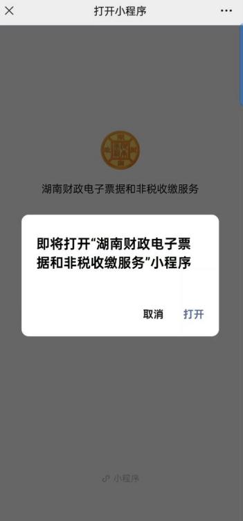 7. 点击“缴费 ”,页面自动跳转到“湖南财政电子票据和非税收缴服务 ”小程序,点击“打开 ”进行缴费(注:订单需在 30 分钟内完成)。