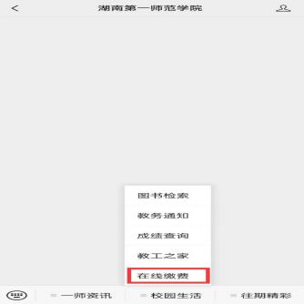 2.进入“湖南第一师范学院 ”微信公众号,点击“校园生活 ”选择“在线缴费 ”。