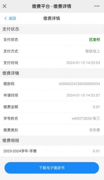 9.选择“已支付 ”可查看通过平台缴费的所有记录,点击“下载电子缴款书 ”生成湖南非税收入一般缴款书电子发票,根据需要自行下载保存。