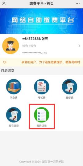 8.支付完成后回到网络缴费平台首页。点击“我的记录 ”。