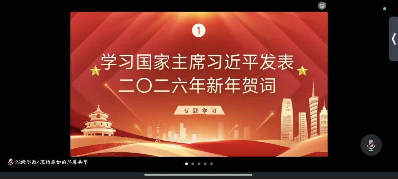本次专题学习聚焦习近平总书记二〇二六年新年贺词,学生党员杨惠如同志带领全体成员深刻领会贺词中回望“十四五”奋斗历程、展望“十五五”光明前景的深刻内涵,结合思政专业学习实际,围绕“青年在中国式现代化进程中的使命担当”展开交流,全体成员一致表示要将贺词中的温暖与力量转化为服务同学、践行使命的实际行动,在新时代新征程上贡献青春力量。