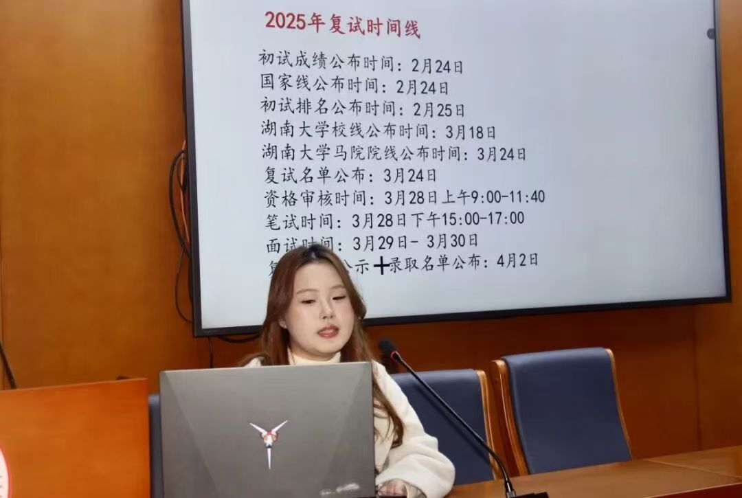 随后,经验分享环节正式拉开帷幕。本次大会采用“线上+线下” 联动模式,干货满满。来自湖南大学的张雅学姐系统梳理了复试全流程时间线与笔试、面试备考策略,提醒同学们深耕专业,关注时事;同样来自湖南大学的张雨轩学姐手把手指导简历制作与自我介绍技巧,助力学子打造亮眼复试“第一印象”;湖南师范大学胡沁彤学姐拆解复试形式,分享了高效的备考规划与时间管理经验;湖南师范大学的邱扬学姐专注于心态调适,为同学们传授情绪管理秘籍,传授稳定发挥的临场技巧;南京师范大学喻雨妍学姐与华中师范大学唐璐璐学姐,则分别从礼仪规范、模拟面试训练及仪容仪表等细节入手,提出了“沉浸式演练”的实用方法,强调从容展现马院学子的精神风貌。